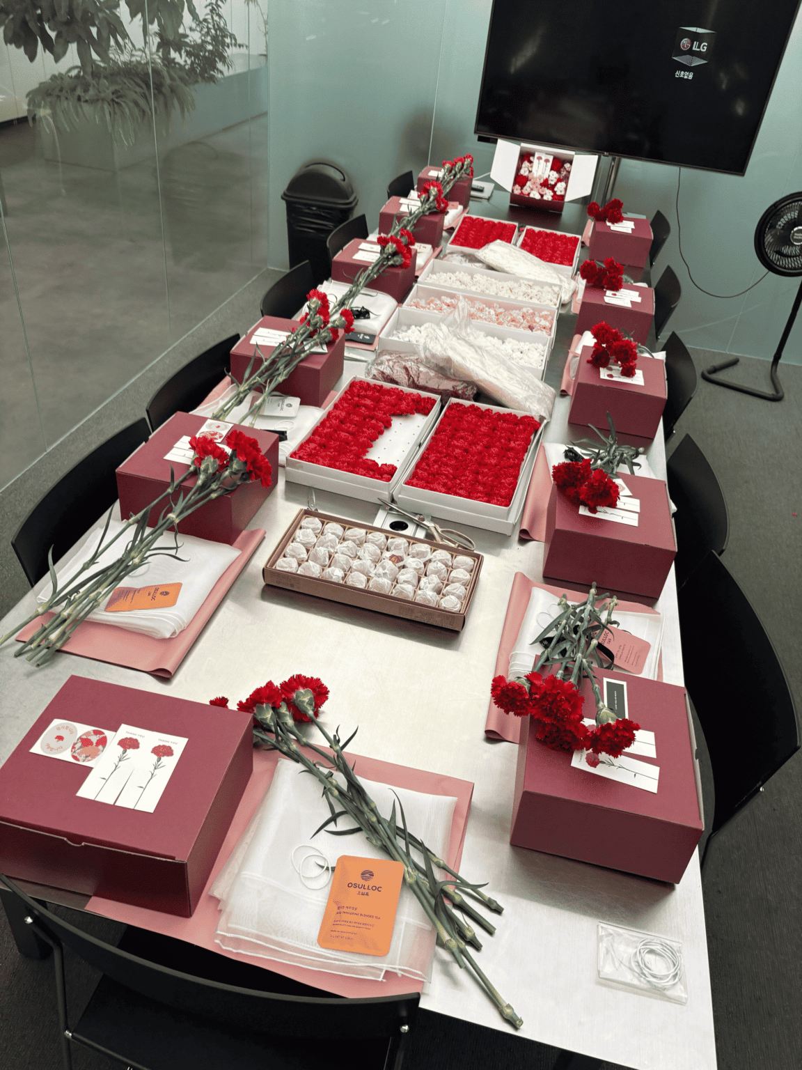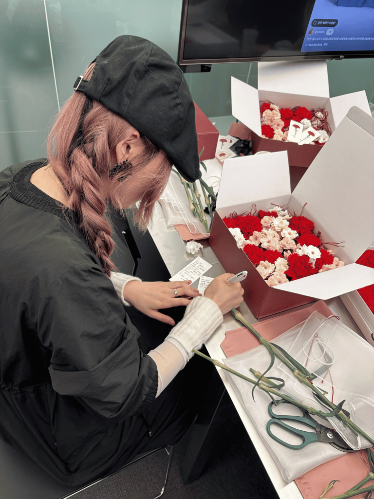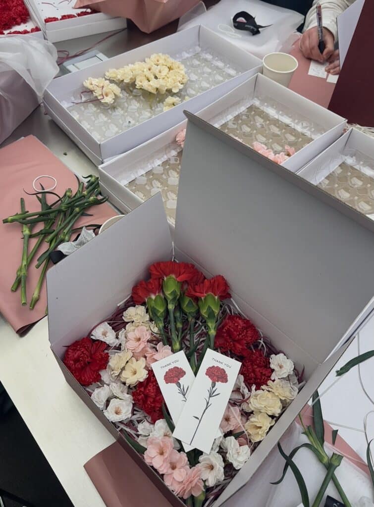 정성이 가득 담긴 카네이션 선물을 제작 중인 팀원들