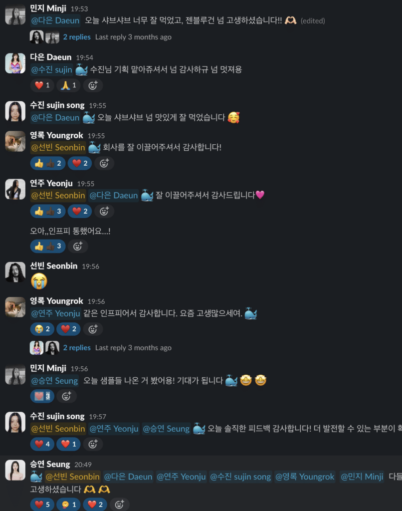 A: ‘아기고래 문화’가 가장 인상 깊었어요. 이건 서로를 칭찬하는 문화인데, 슬랙에서 누군가를 칭찬하고 고래 이모티콘을 달아줘요. 그 고래를 가장 많이 받은 사람이 상을 받기도 하는데, 사실 상보다 더 중요한 건 그 자체로 팀 분위기가 정말 훈훈해진다는 거예요. 일을 하다 보면 힘든 순간이 오잖아요?
