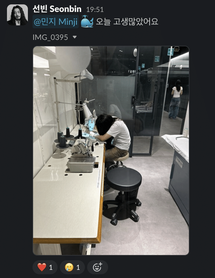 A: 뭐니 뭐니 해도 사무실 위치가 진짜 최고죠. 동대문이랑 너무 가까워서 언제든지 필요한 자재를 빠르게 구할 수 있어요. 특히 동대문에 가야 할 일이 잦은 저희 팀에게는 이게 큰 장점이에요. 그리고 사무실 건물에 다이소, 편의점 같은 시설도 있어서 점심시간에 굳이 밖으로 나갈 필요가 없다는 점도 정말 편리해요. 이 모든 게 사무실에 있으면 한 번에 해결되니까요.